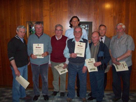 Für 50-jährige Mitgliedschaft wurden vom Vorsitzenden Peter Tillinger jun. (M) zu Ehrenmitglieder ernannt: Richard und Walter Bauschert, Helmut Birgel, Philipp Bohland, Anton Teppert, Josef Harti und Johann Holz. (vlnr)